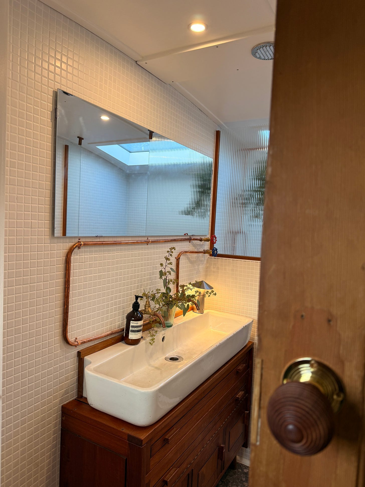 My favourite thing is that it doesn’t feel like a boat at all. From the beginning, we were quite obsessed with making it feel like a real house that just happens to float. The proportions, the light, the materials – it was all considered through that lens. We also tried to source as much second hand as possible – the bathroom butler sink, vanity, and floorboards all came from ebay!